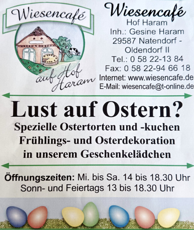 Wir wünschen unseren Gästen frohe Ostern und einen starten mit Ihnen in eine weitere Saison im Wiesencafé Hof Haram. Wir freuen uns auf Ihren Besuch. Bei gutem Wetter ist unsere Terrassensaison ab sofort wieder eröffnet.